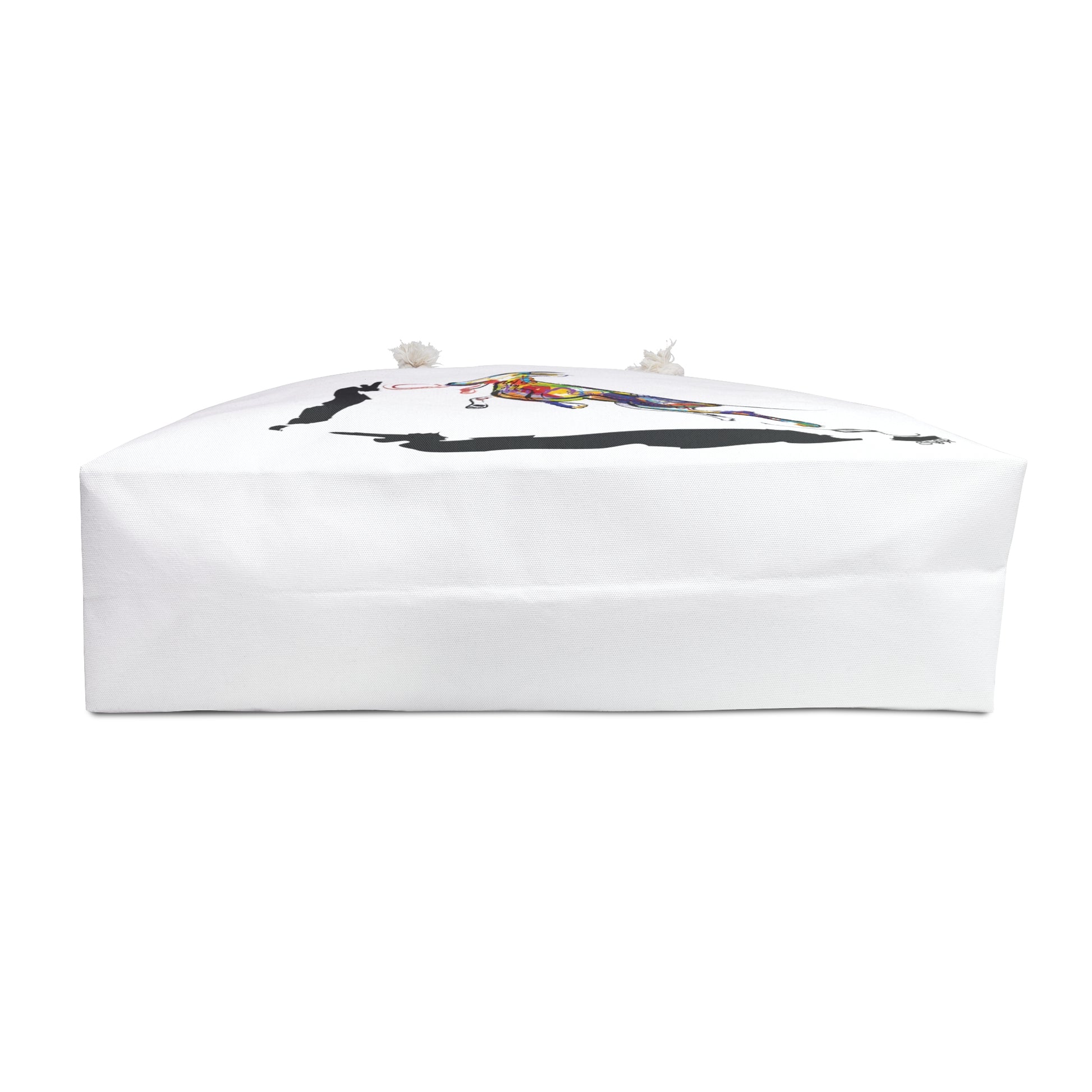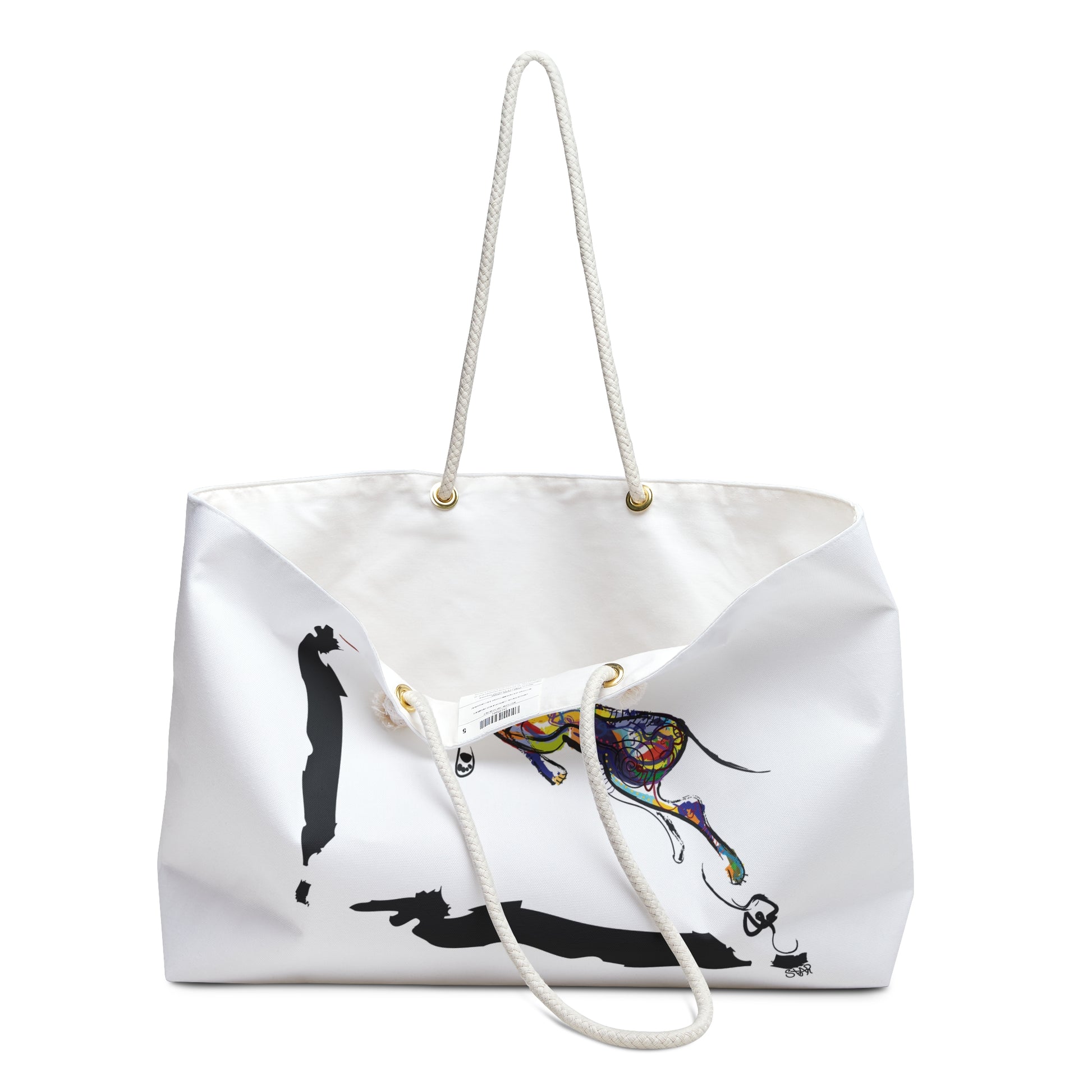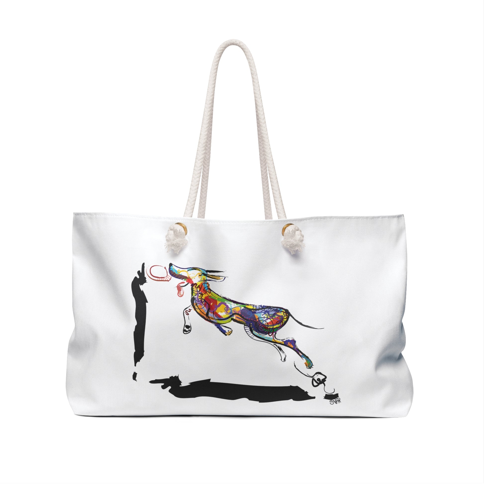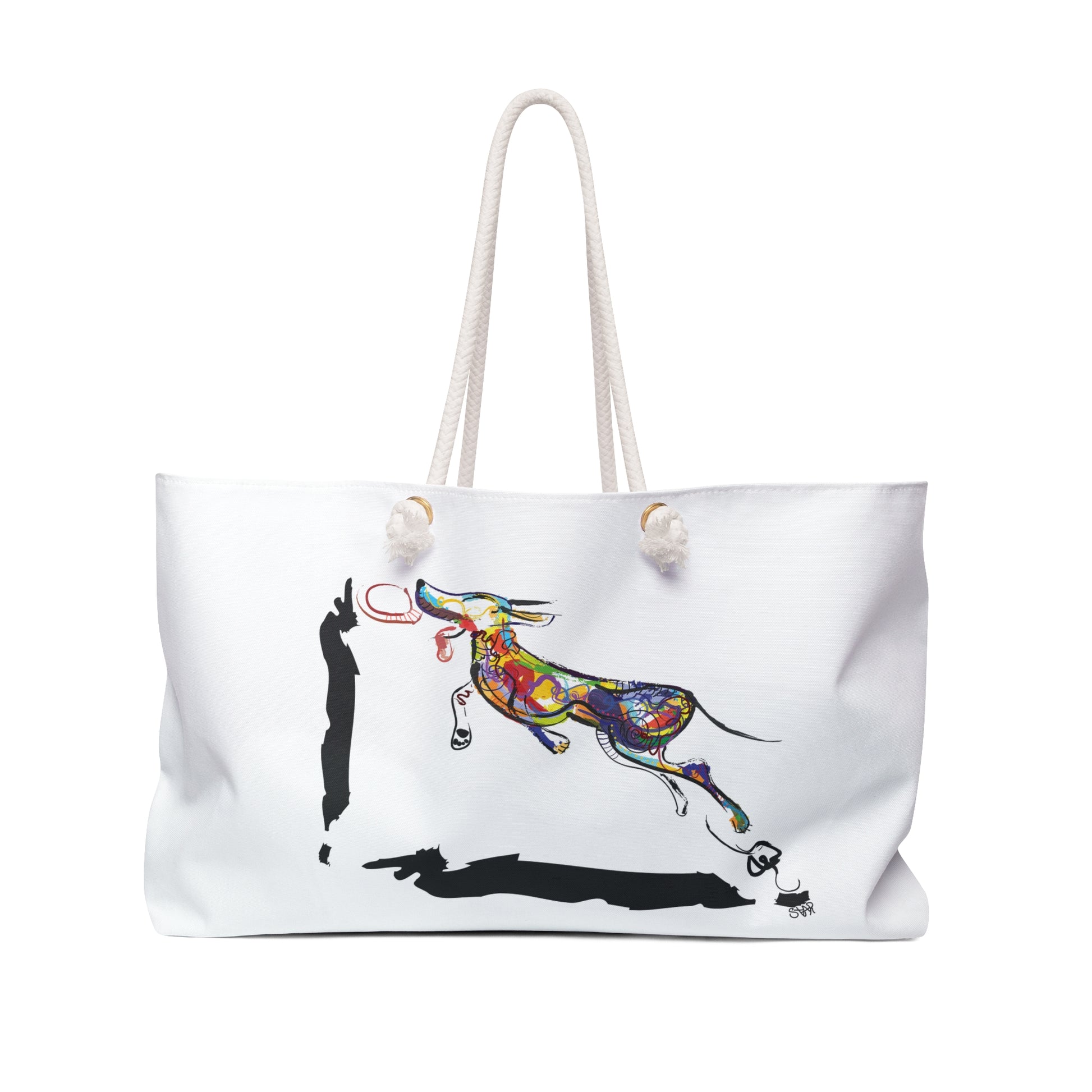 An oversized Weekender Tote is perfect for your weekend at the beach or in town. The wide-mouthed, durable bag holds a generous amount of personal items and is easily held by its thick rope handles. Featuring the art piece "Dog and Frisbee" by Fine Artist Star Abernathy.